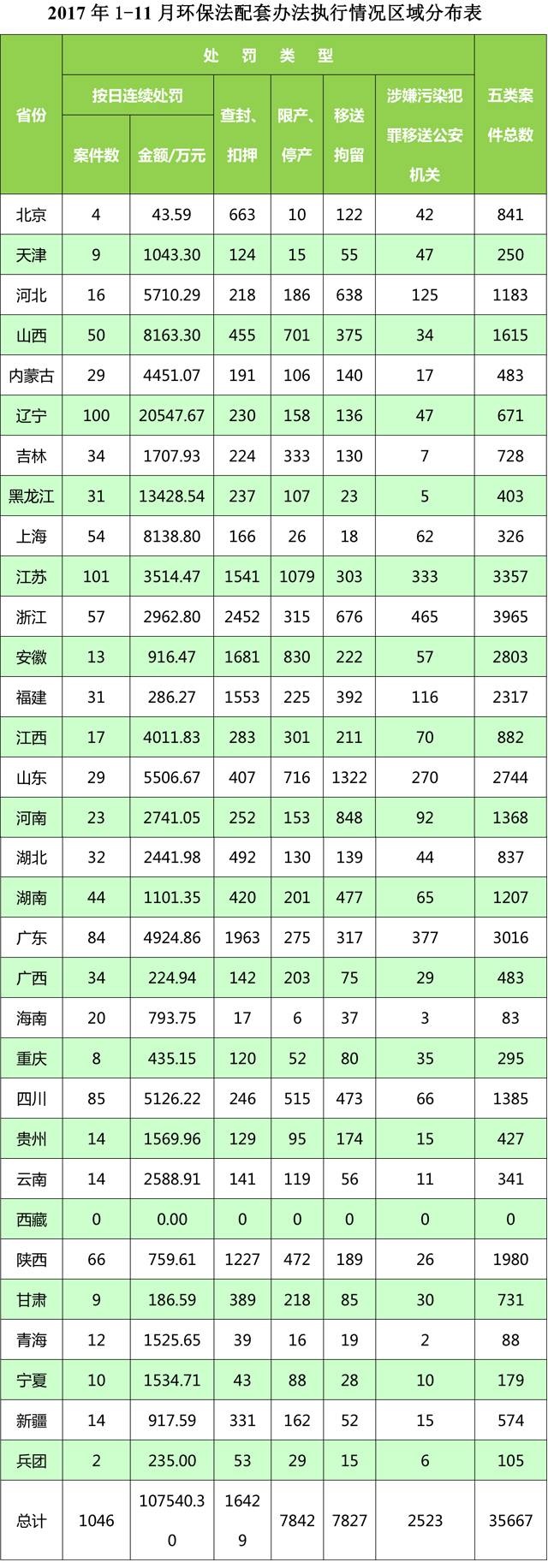 環(huán)保部想媒體通報(bào)2017年1-11月各地執(zhí)行《環(huán)境保護(hù)法》配套辦法及移送環(huán)境犯罪案件的情況。并對(duì)1-11月份案件較多的浙江、江蘇、廣東、安徽、山東、福建等地進(jìn)行表揚(yáng)。