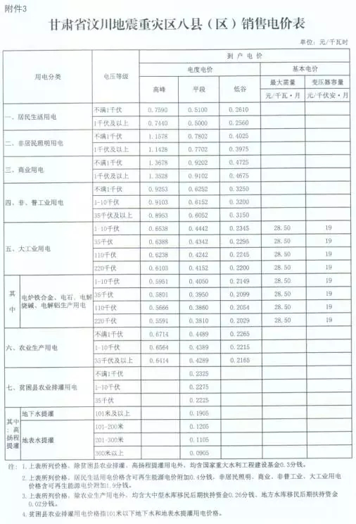 3、甘肅省汶川地震重災(zāi)區(qū)八縣(區(qū))銷售電價表