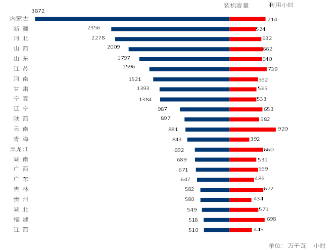 圖3 1-3月份風(fēng)電裝機(jī)較多省份風(fēng)電裝機(jī)容量和設(shè)備利用小時