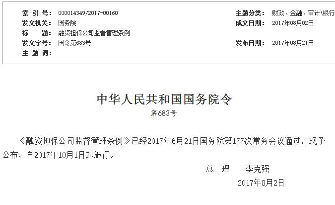 為了規(guī)范融資擔(dān)保公司的行為,防范風(fēng)險,2017年8月2日,國務(wù)院總理李克強簽署國務(wù)院令683號,公布《融資擔(dān)保公司監(jiān)督管理條例》(以下簡稱條例),自2017年10月1日起施行。