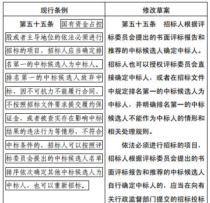 一、將第五十五條修改為:“招標(biāo)人根據(jù)評標(biāo)委員會提出的書面評標(biāo)報(bào)告和推薦的中標(biāo)候選人確定中標(biāo)人。招標(biāo)人也可以授權(quán)評標(biāo)委員會直接確定中標(biāo)人,或者在招標(biāo)文件中規(guī)定排名第一的中標(biāo)候選人為中標(biāo)人,并明確排名第一的中標(biāo)候選人不能作為中標(biāo)人的情形和相關(guān)處理規(guī)則。