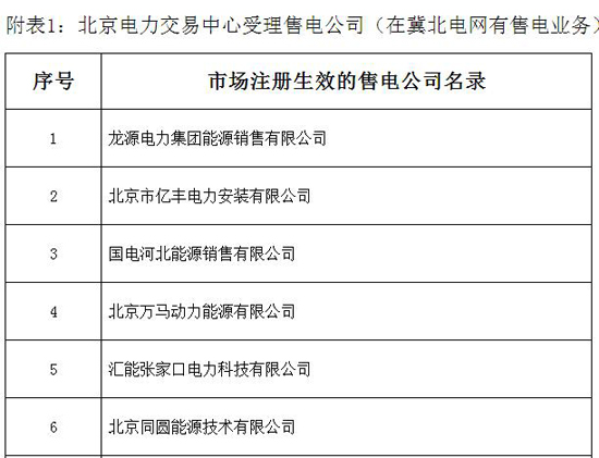 冀北電力交易中心有限公司于2017年10月19日至2017年11月19日共對13家售電公司進行了公示,具體為:北京電力交易中心受理并在冀北電網(wǎng)有售電業(yè)務(wù)的龍源電力集團能源銷售有限公司等9家售電公司;北京電力交易中心推送業(yè)務(wù)范圍變更至冀北的北京經(jīng)開智控能源管理股份有限公司等4家售電公司。