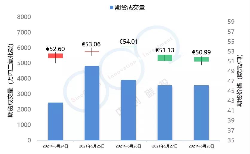2021年5月24日至5月28日,由于全球能源市場表現(xiàn)較為疲軟,市場投資者對于配額需求的預(yù)期不景氣,歐盟碳市場在本周總體呈現(xiàn)下跌趨勢,在本周三漲至53.59歐元/噸的頂峰后,隨即下跌近5個(gè)點(diǎn),最終收于50.95歐元/噸,回落至接近本月初水平。英國碳市場自上周三開市后,在本周迎來交易的第一個(gè)整周,在短期試探了59.52歐元/噸的碳價(jià)后,英國碳價(jià)逐步回落至56.49歐元/噸,該趨勢與歐盟碳市場基本保持一致。本周歐盟碳市場期貨成交量達(dá)到1.84億噸,配額拍賣量為平均每天300萬噸左右。英國碳市場本周拍賣成交量達(dá)到207萬噸。據(jù)悉,英國政府正在考慮增加2021年英國碳市場配額的拍賣供應(yīng)。
